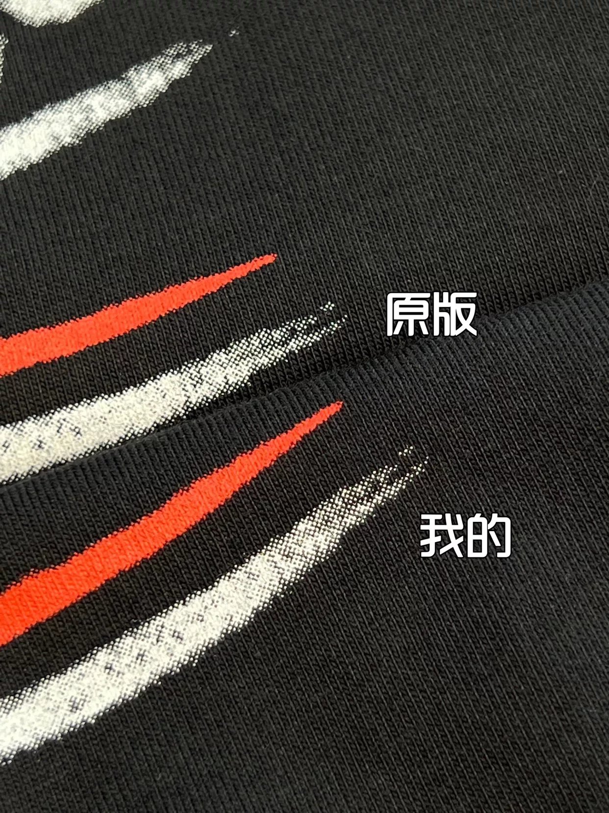 1.整体对比: 原版印花工艺采用丝网印刷 进口混合调配胶浆 市面上很多都是聪明反被聪明误 用什么直喷工艺