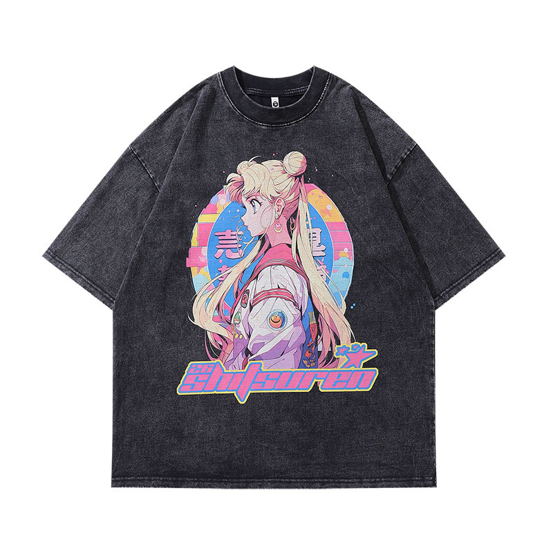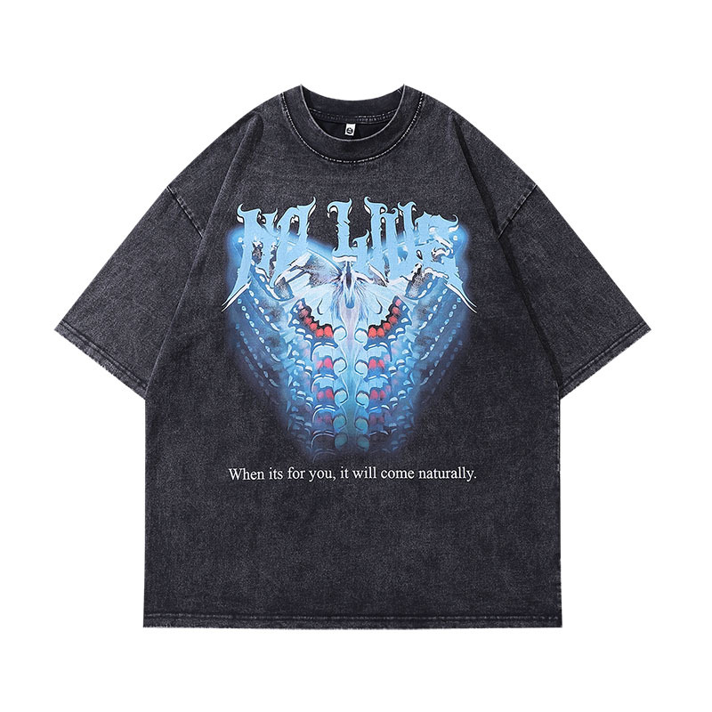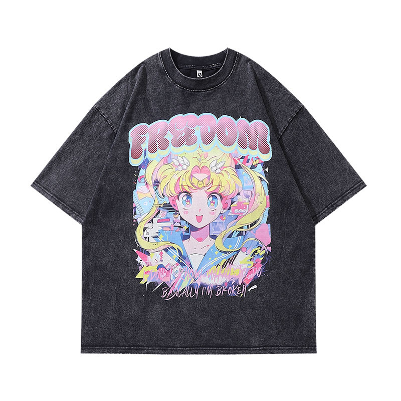 TKPA Street Fashion Brand Animation Printing Small Collar Half Sleeve T-shirt Men's and Women's National Fashion Retro Wash Water Short Sleeve Base tee