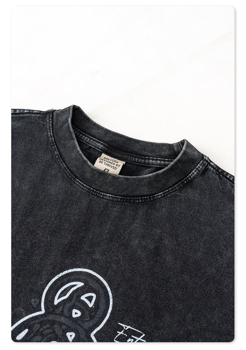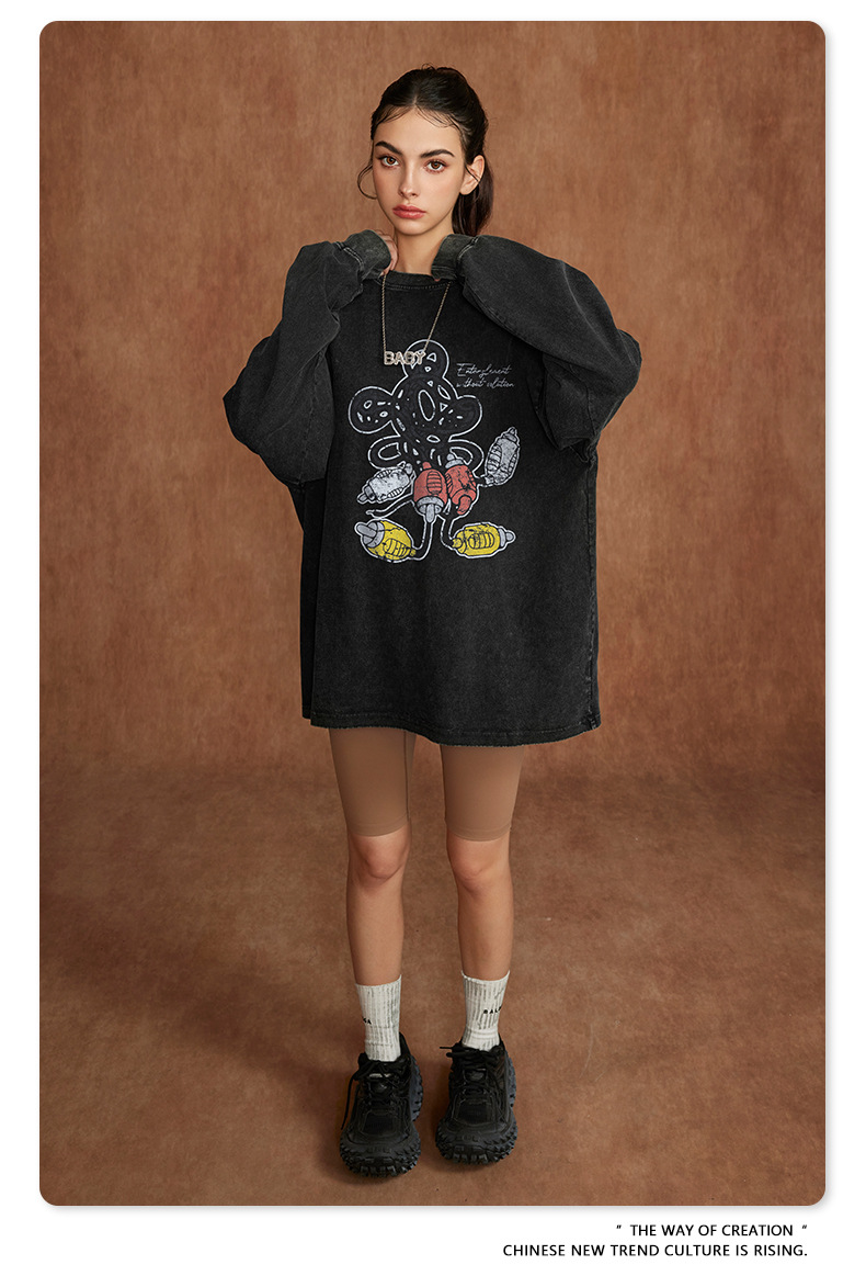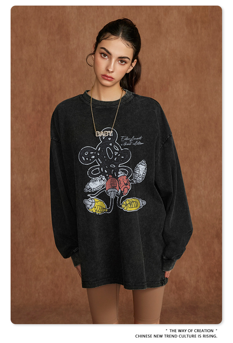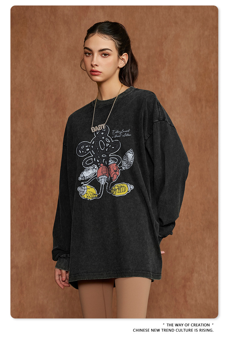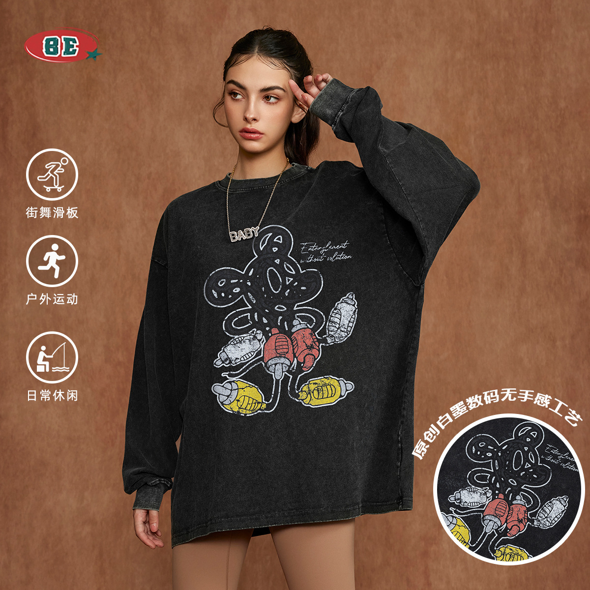 BE men's | 2024 spring and autumn loose European and American washed Mickey fun cotton trend washed long sleeve T-shirt men