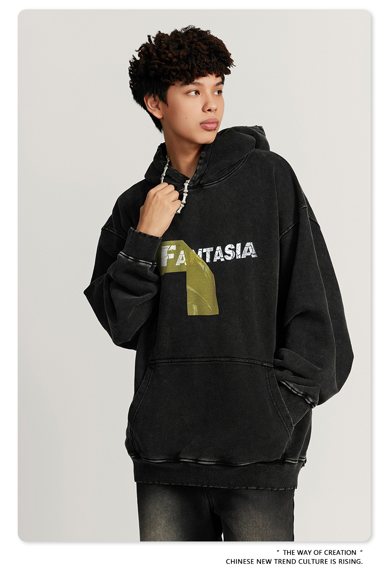 BE Men's 2024 Autumn and Winter Loose American Cross-border Retro Washed Sweat Kuso Sticker Hooded Sweat Trendy Men