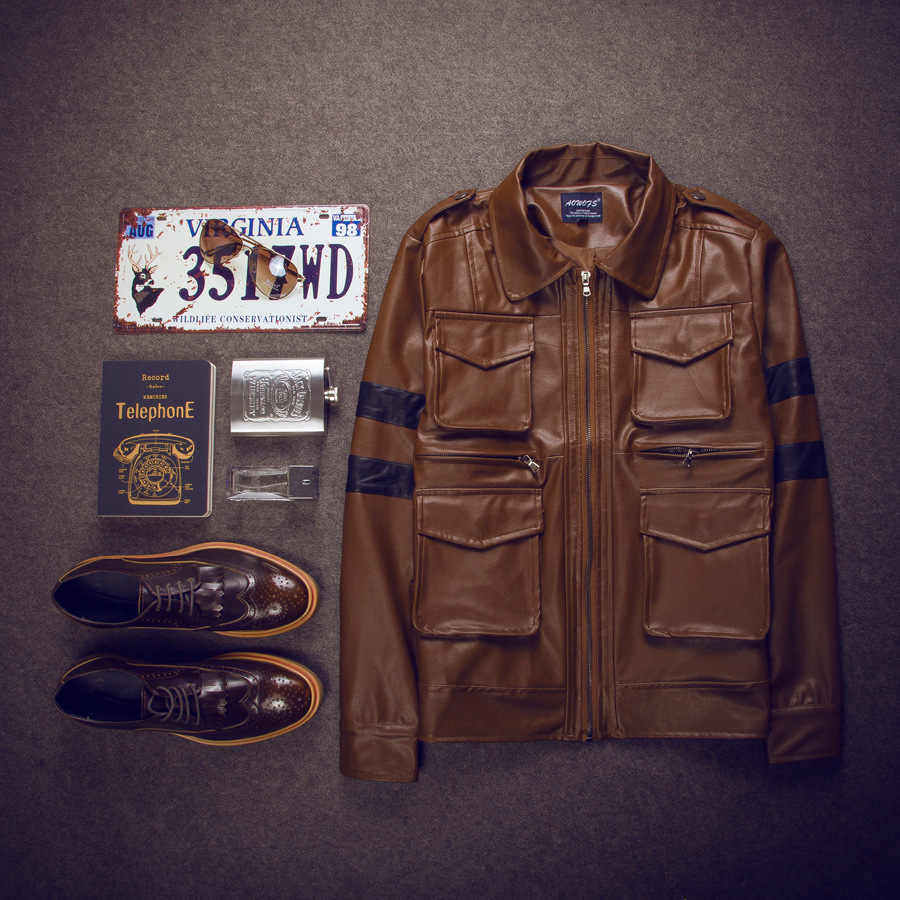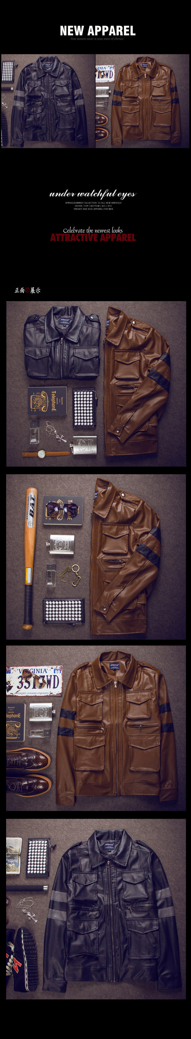 New Lotte Men's Short Leather Fashion Japanese-style Vertical Collar Pocket Insert Color Men's Leather Jacket Boutique Y013