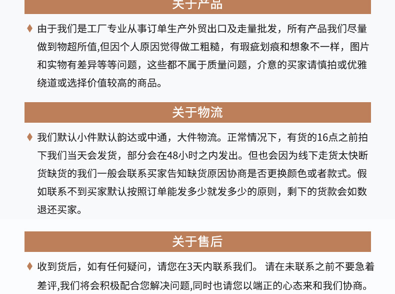 Third-party Products: KameyMall-Agent sources products from third-party platforms and is not the direct seller. If a product results in infringement issues, the responsibility lies with the third-party seller, and KameyMall-Agent holds no related liability. No Professional Inspection: We do not provide professional inspection services for the quality, authenticity, or completeness of products. If defective products are received, we do not offer compensation. If you choose to purchase despite this, we bear no responsibility for any resulting consequences. Limited Inspection: If we cannot access the actual product link, we are unable to check the size, model, color, or quantity, and can only inspect the appearance. If the product received has incorrect size, model, color, or quantity, please verify with the seller. If there's an issue, we do not provide compensation. Choosing to purchase indicates acceptance of these risks.