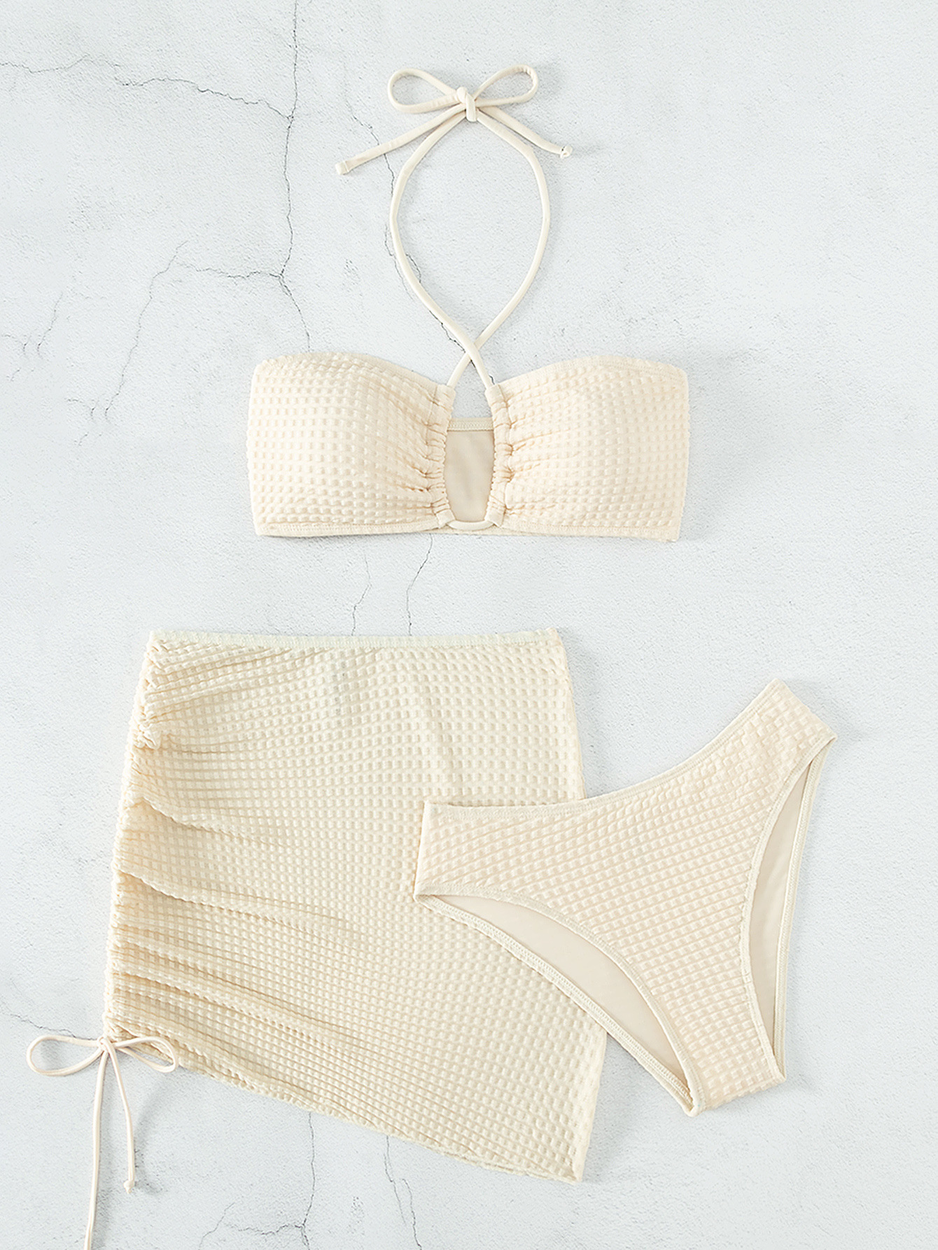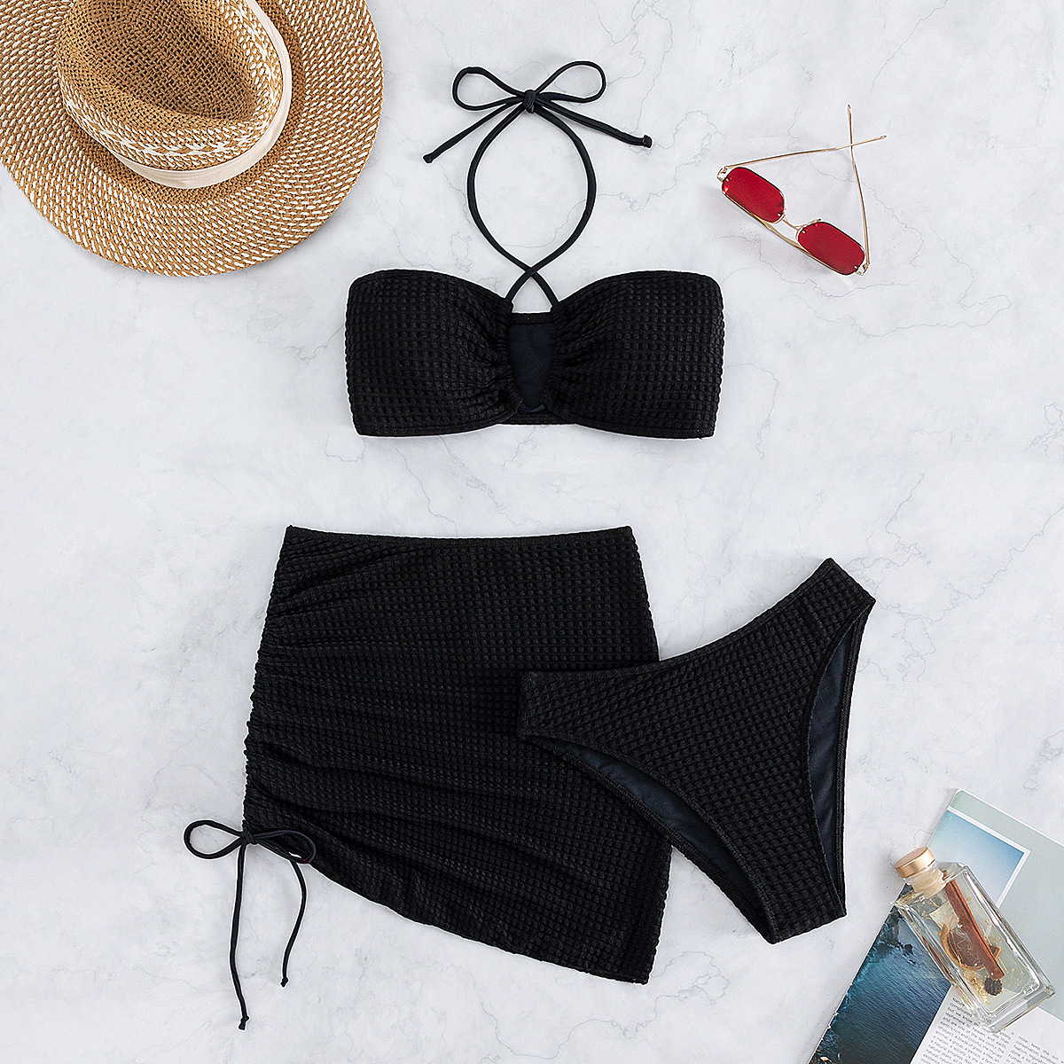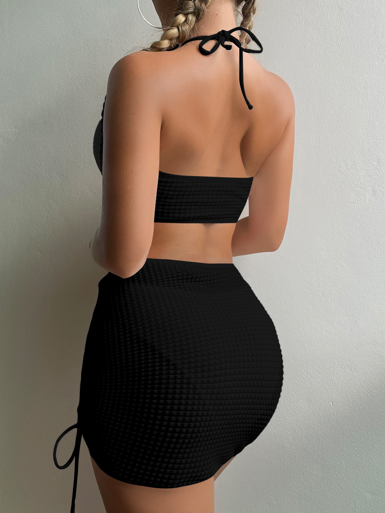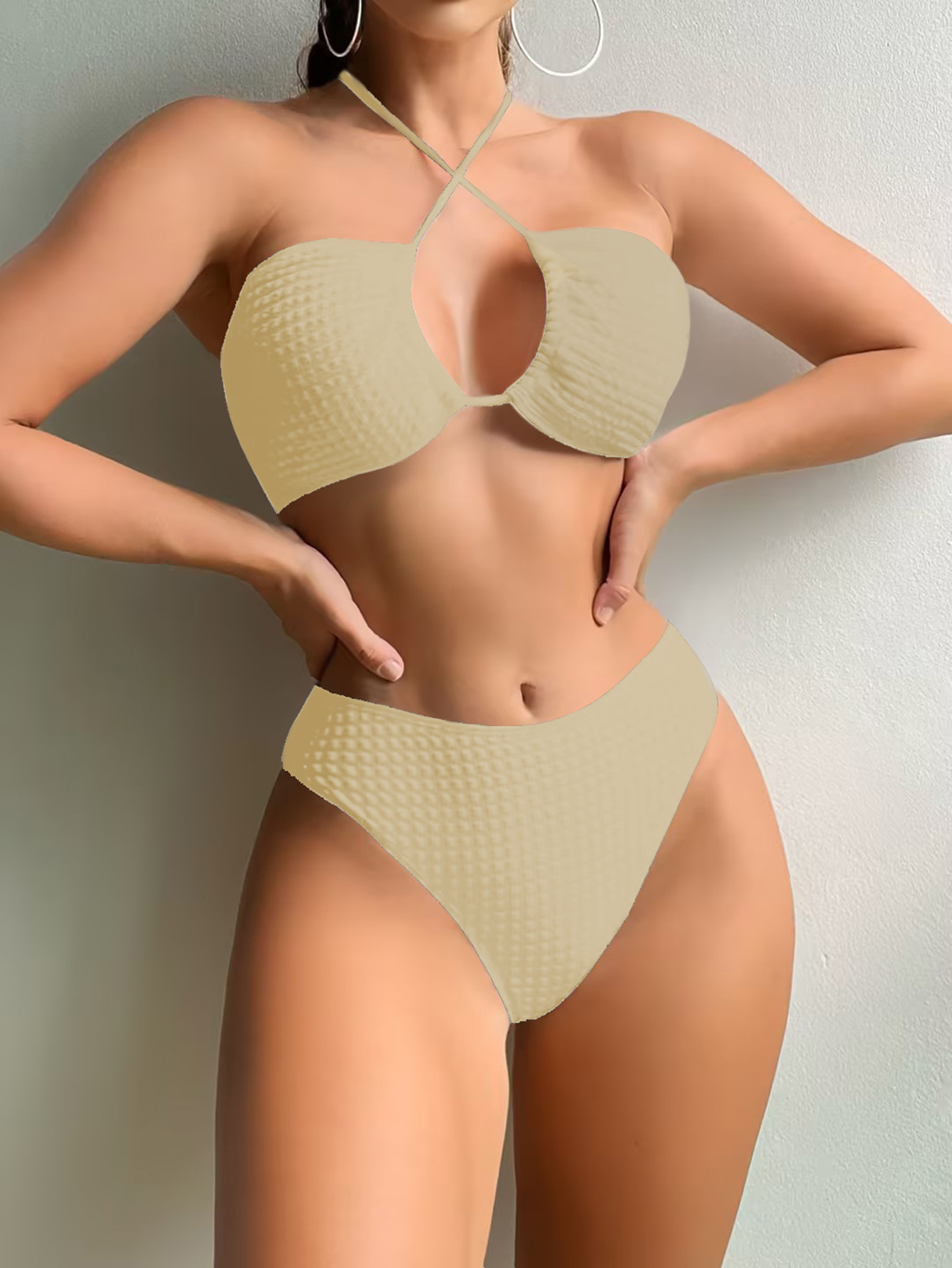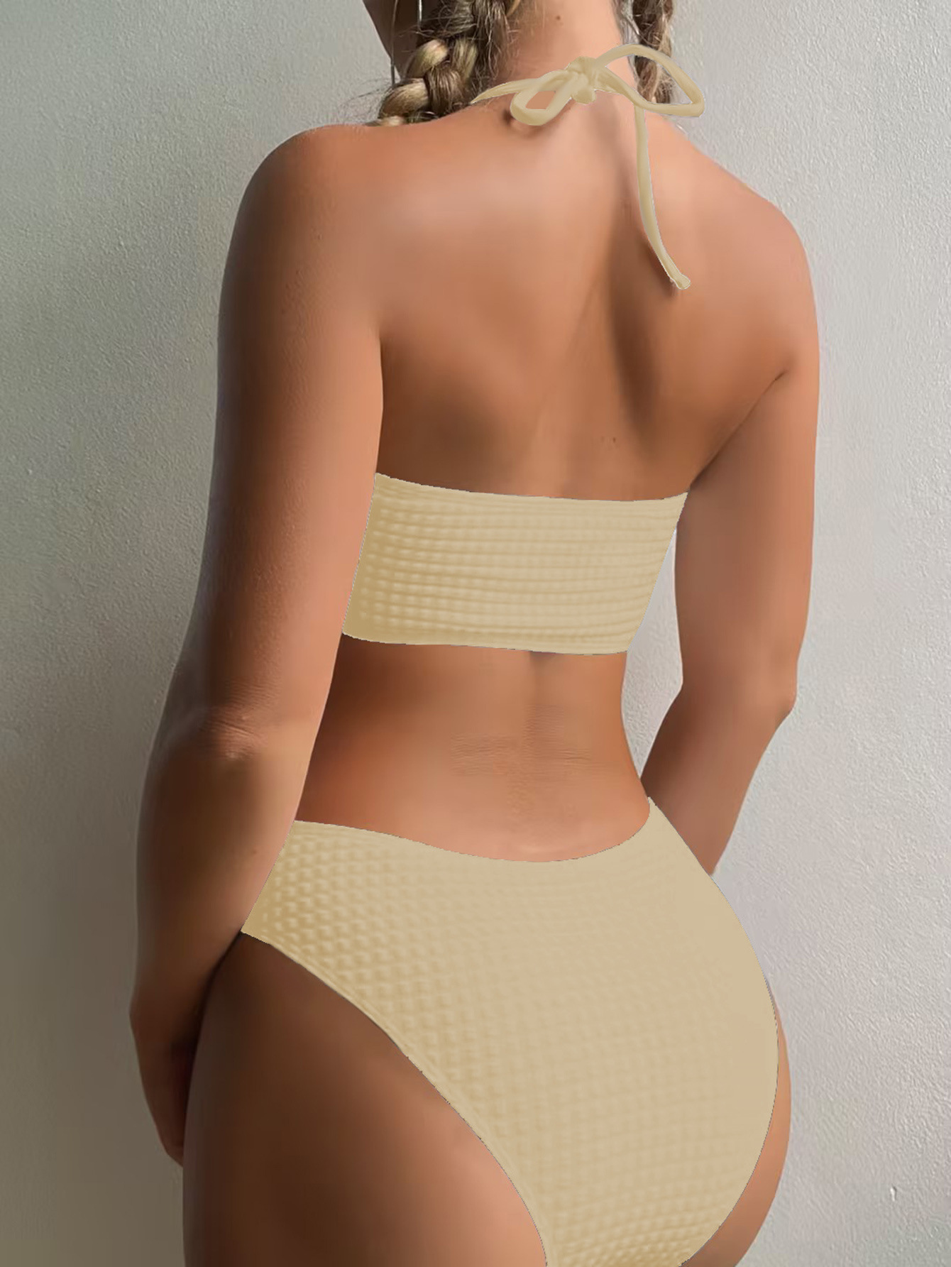 2023 European and American Foreign Trade New Sexy Split Swimsuit Instagram Bikini Solid Color Neck Lace-up Tight Swimsuit for Women