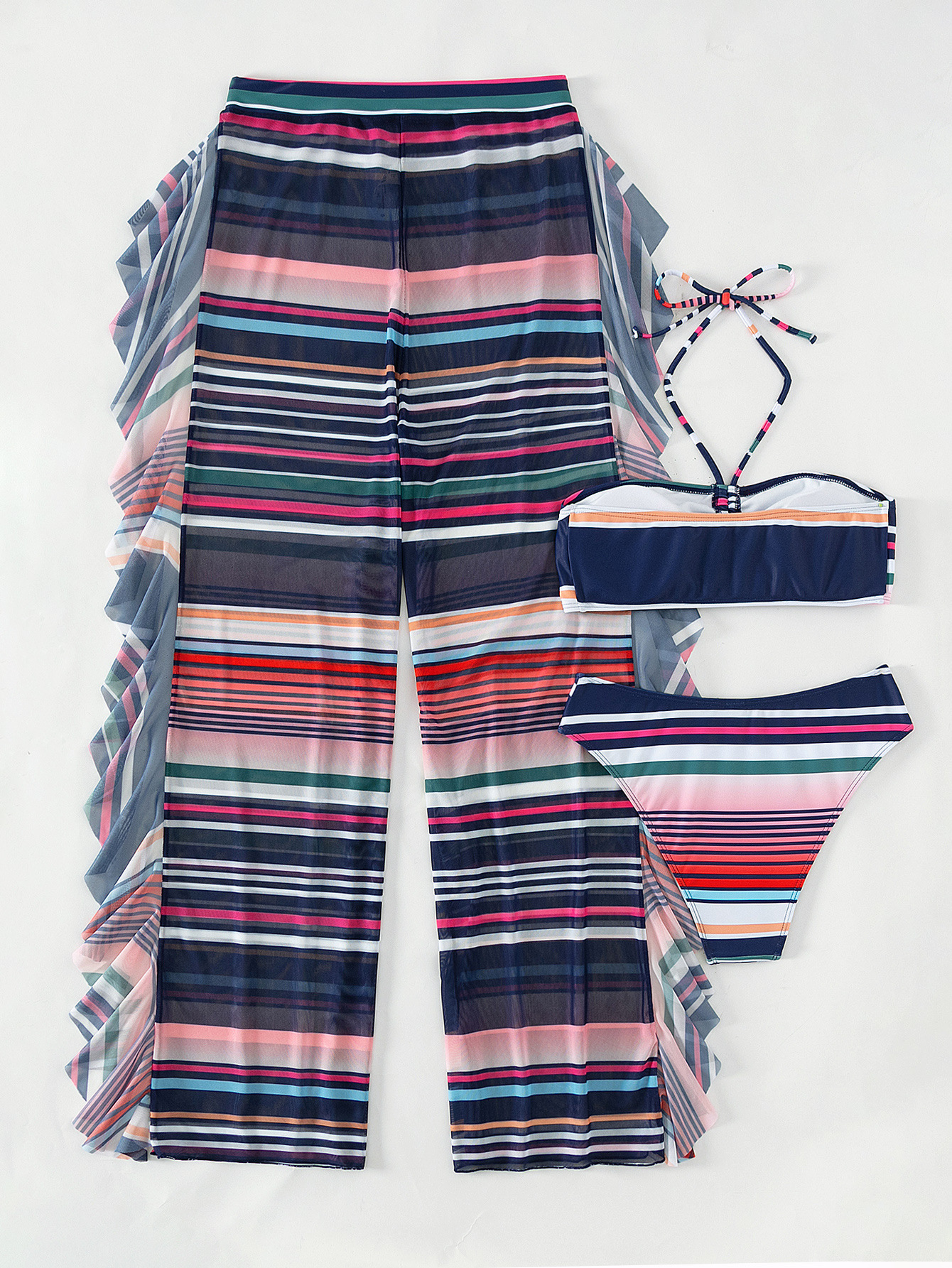 2024 Striped European and American Swimsuit Three-Piece Sexy Ruffled Shale Pants Hanging Neck Tube Top Bikini Bikini Swimsuit