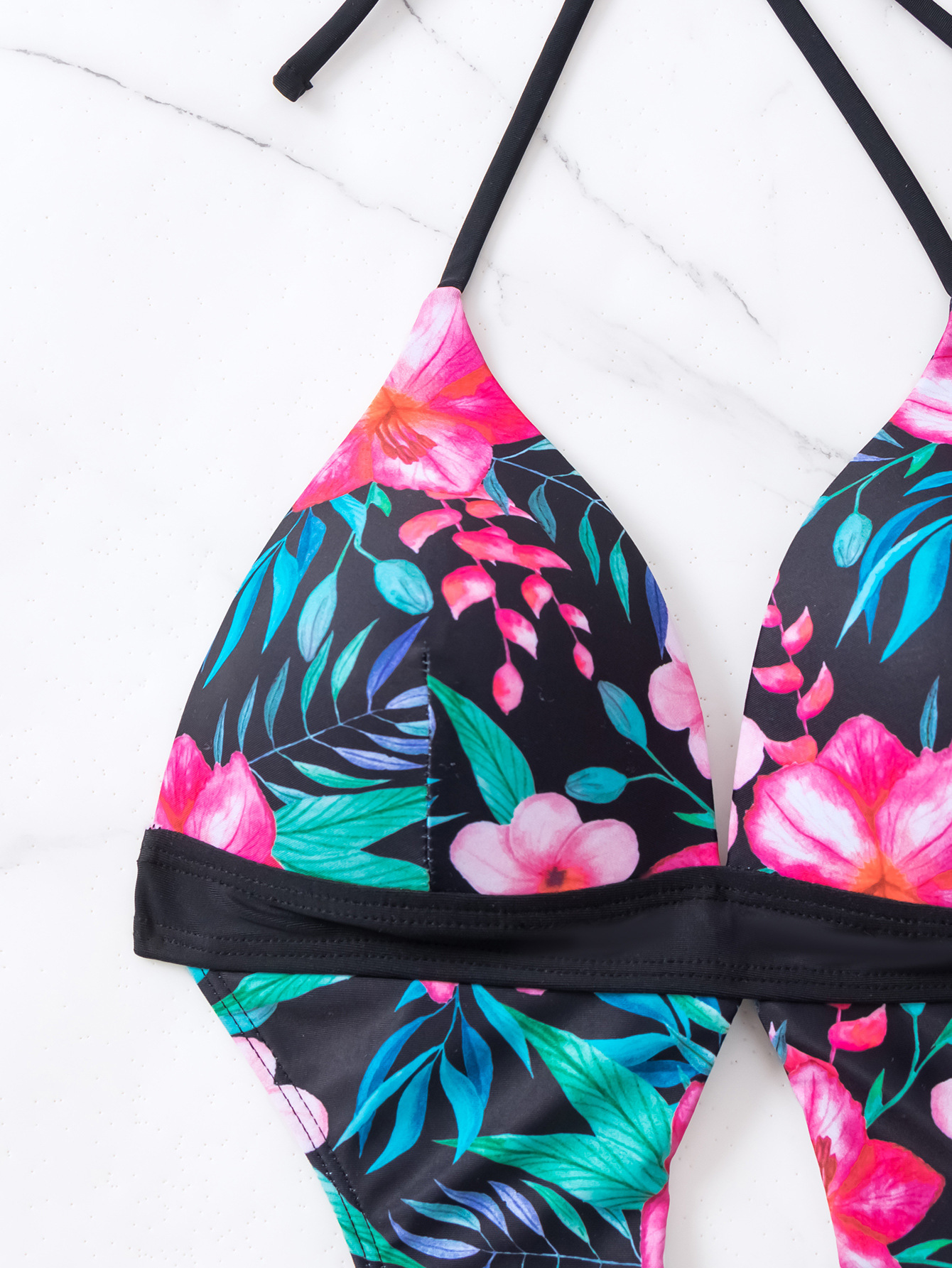 2023 New Foreign Trade European and American Sexy Hollow Bikini Large Backless Neck Printed Fashion Bikini Swimsuit