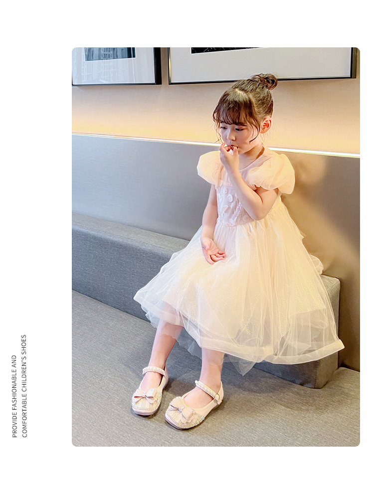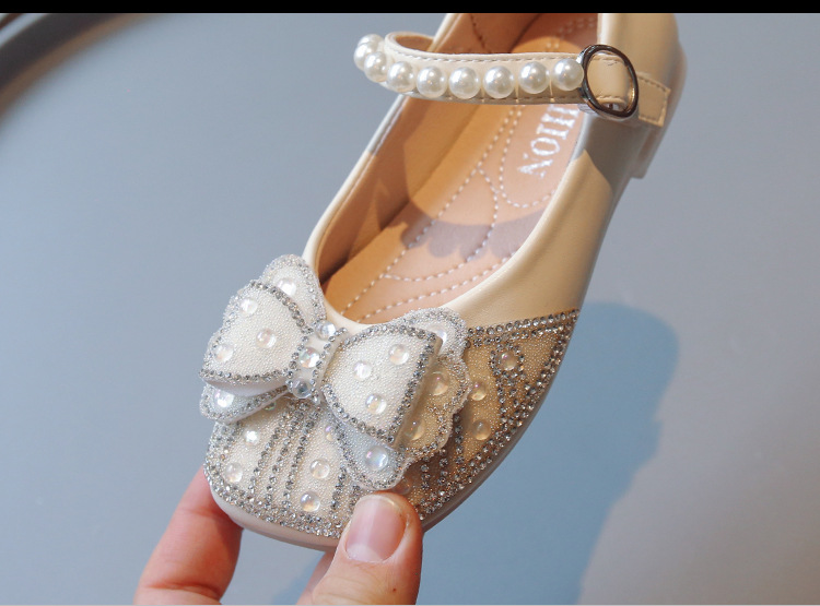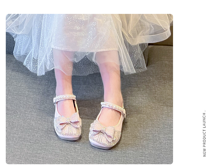 Girl's little leather shoes spring 2024 new children's rhinestone lace bow princess shoes little girl's performance shoes