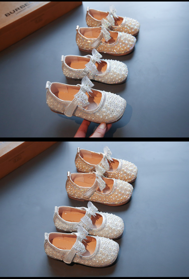Girls Shoes 2024 Spring New Fashion Rhinestone Pearl Little Girl Cute Bow Princess Small Leather Shoes Trendy