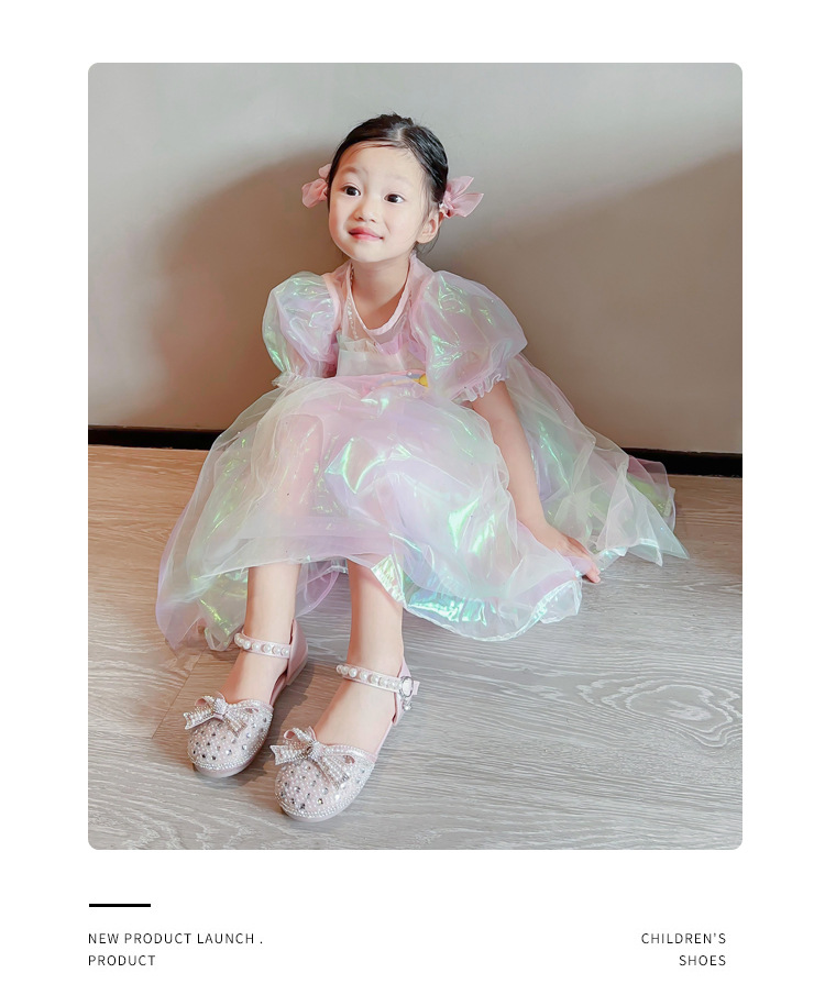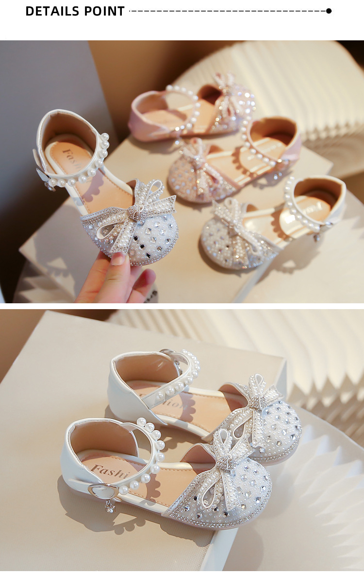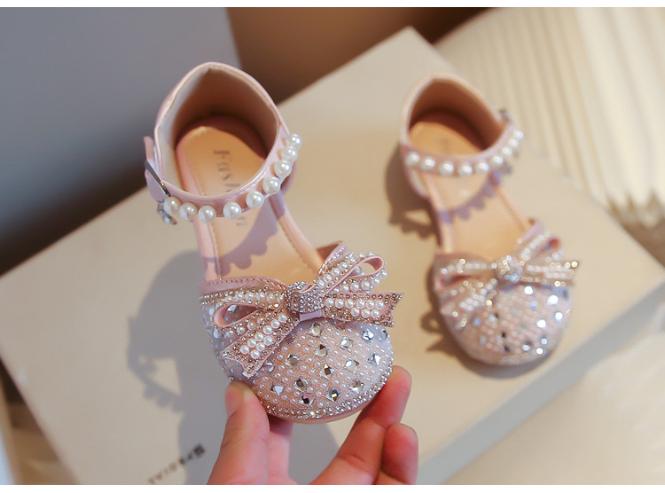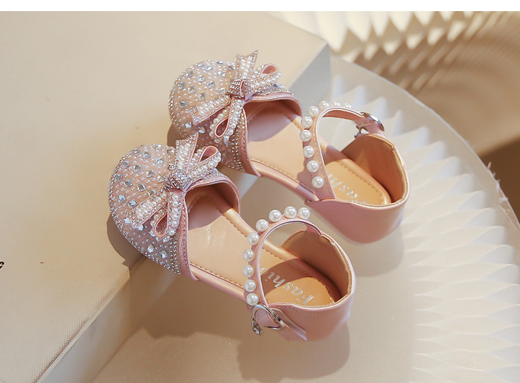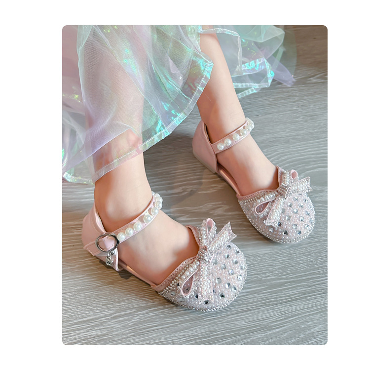 Girls Rhinestone Princess Shoes 2024 Summer New Pearl Bow Shoes Children's Small Medium and Large Children's Half Sandals