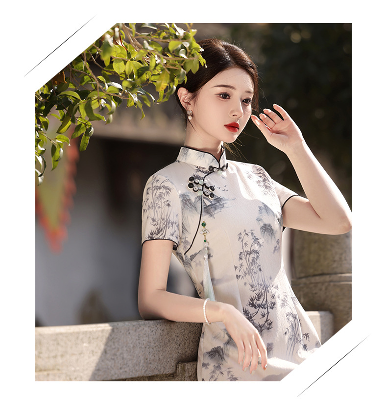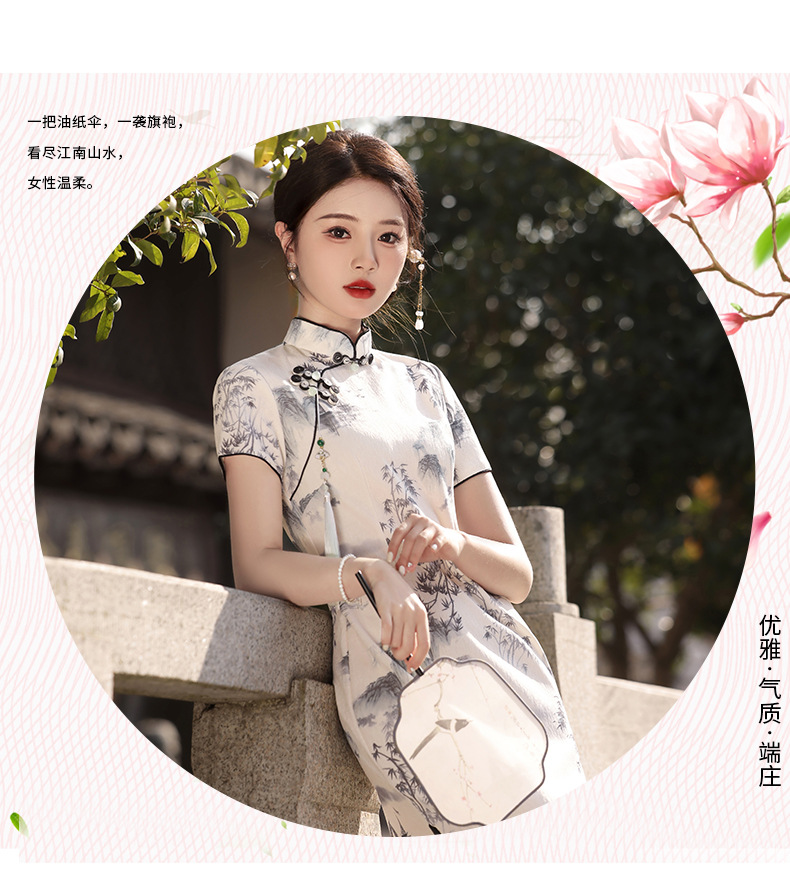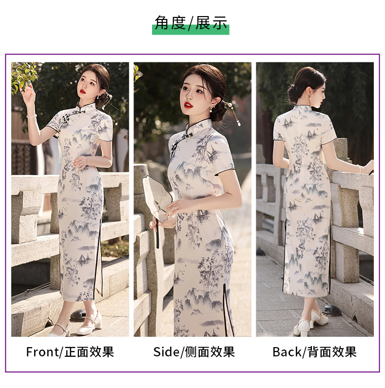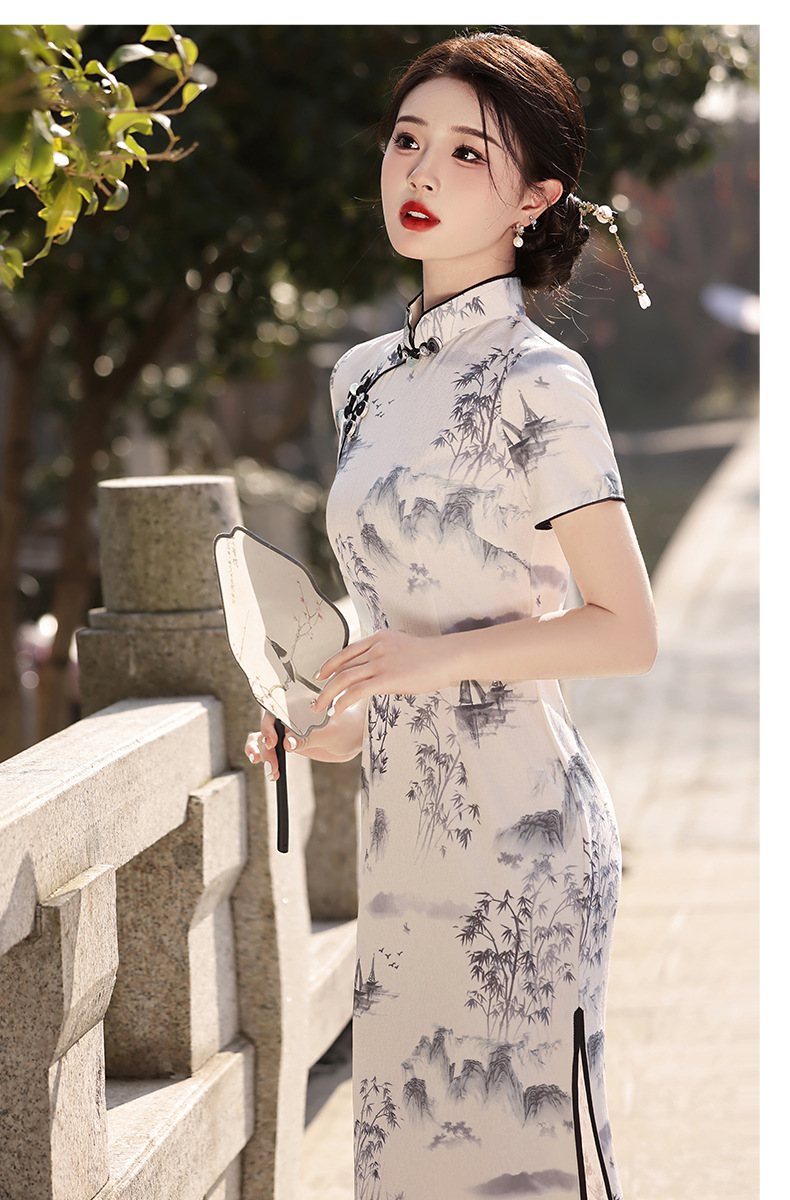 Qianjin Princess Spring New High-end Ink Style Short-sleeved Slim-fit Elegant Long Cheongsam with Vertical Collar