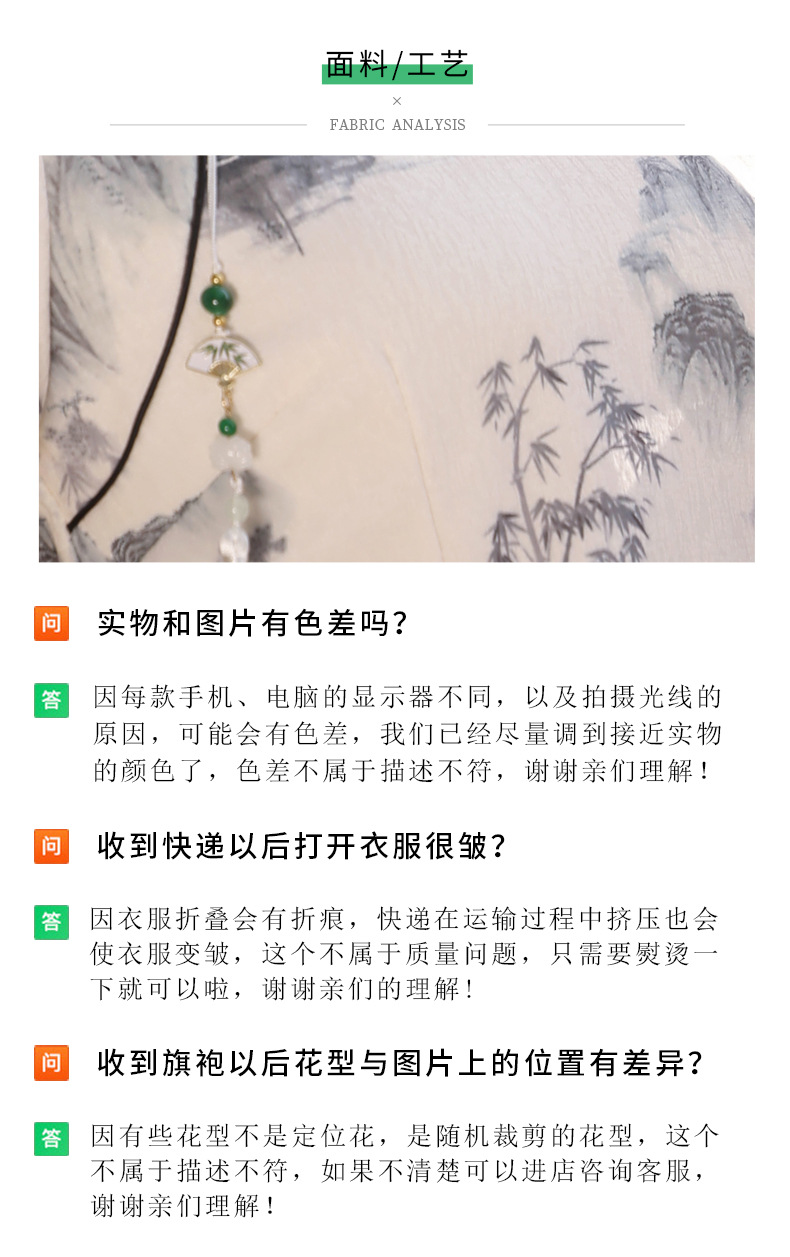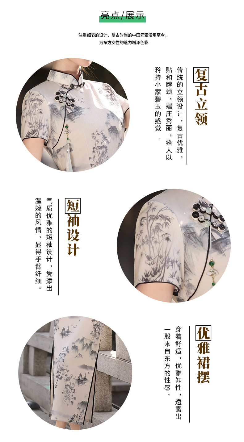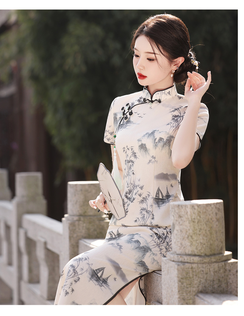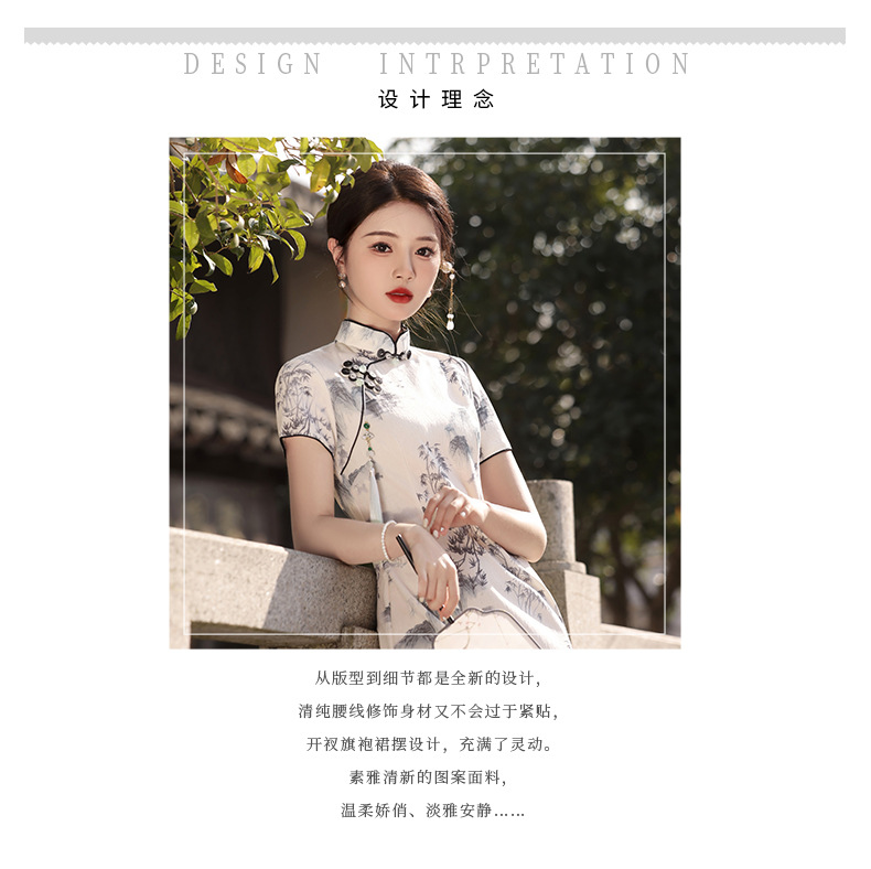 Qianjin Princess Spring New High-end Ink Style Short-sleeved Slim-fit Elegant Long Cheongsam with Vertical Collar