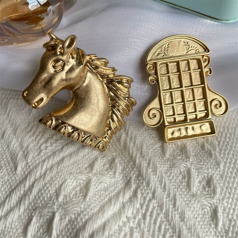 Embossed window horse head brooch for women's court medieval pompous overcoat anti-light retro distressed gold pin men's accessories