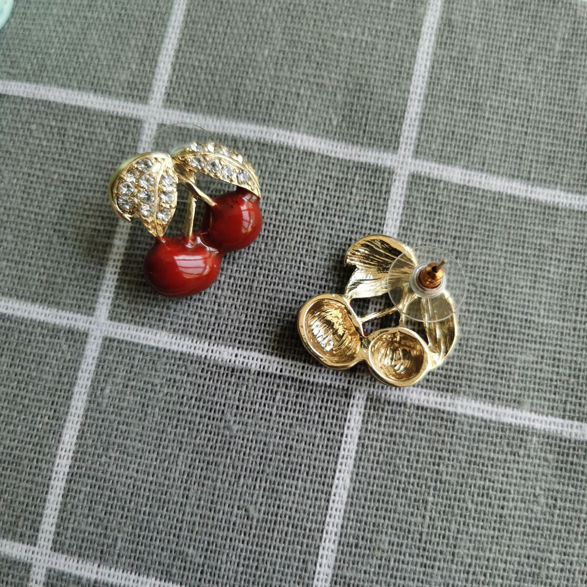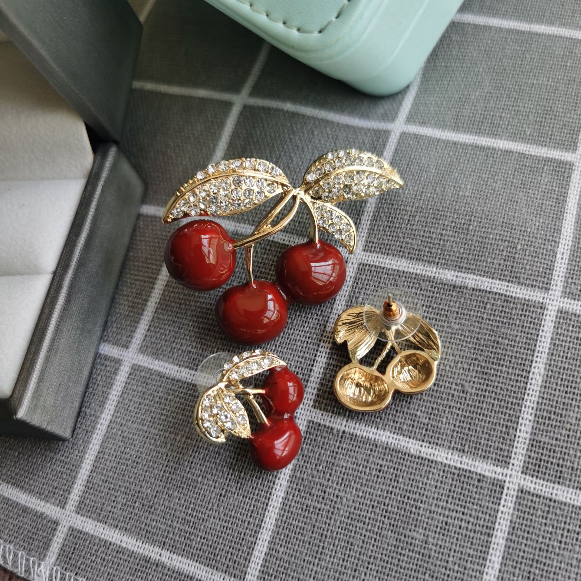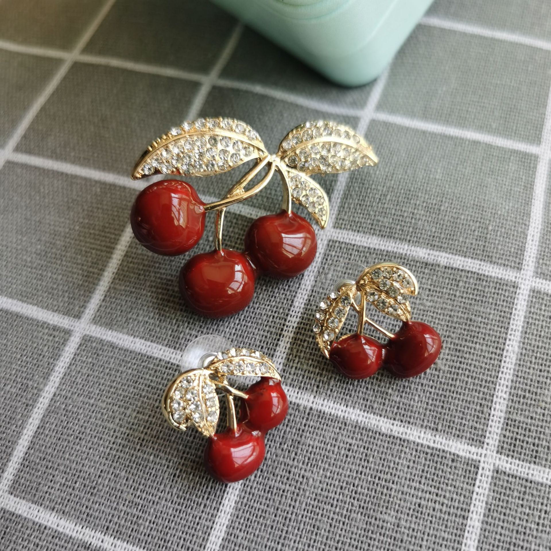 Enamel Fruit Red Cherry Brooch Silver Pin Earrings Middle Ancient Inlaid with Gemstone Alloy Qingdao Jewelry Women's Pin Earrings