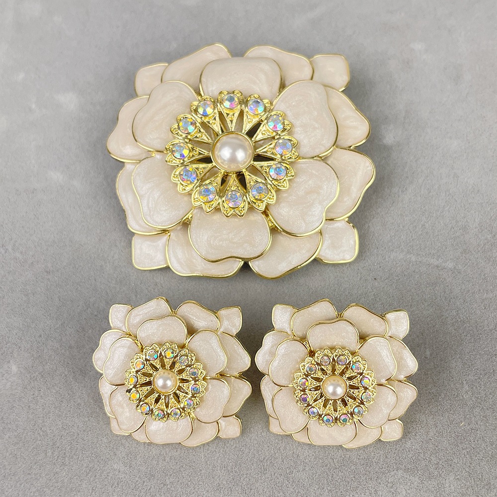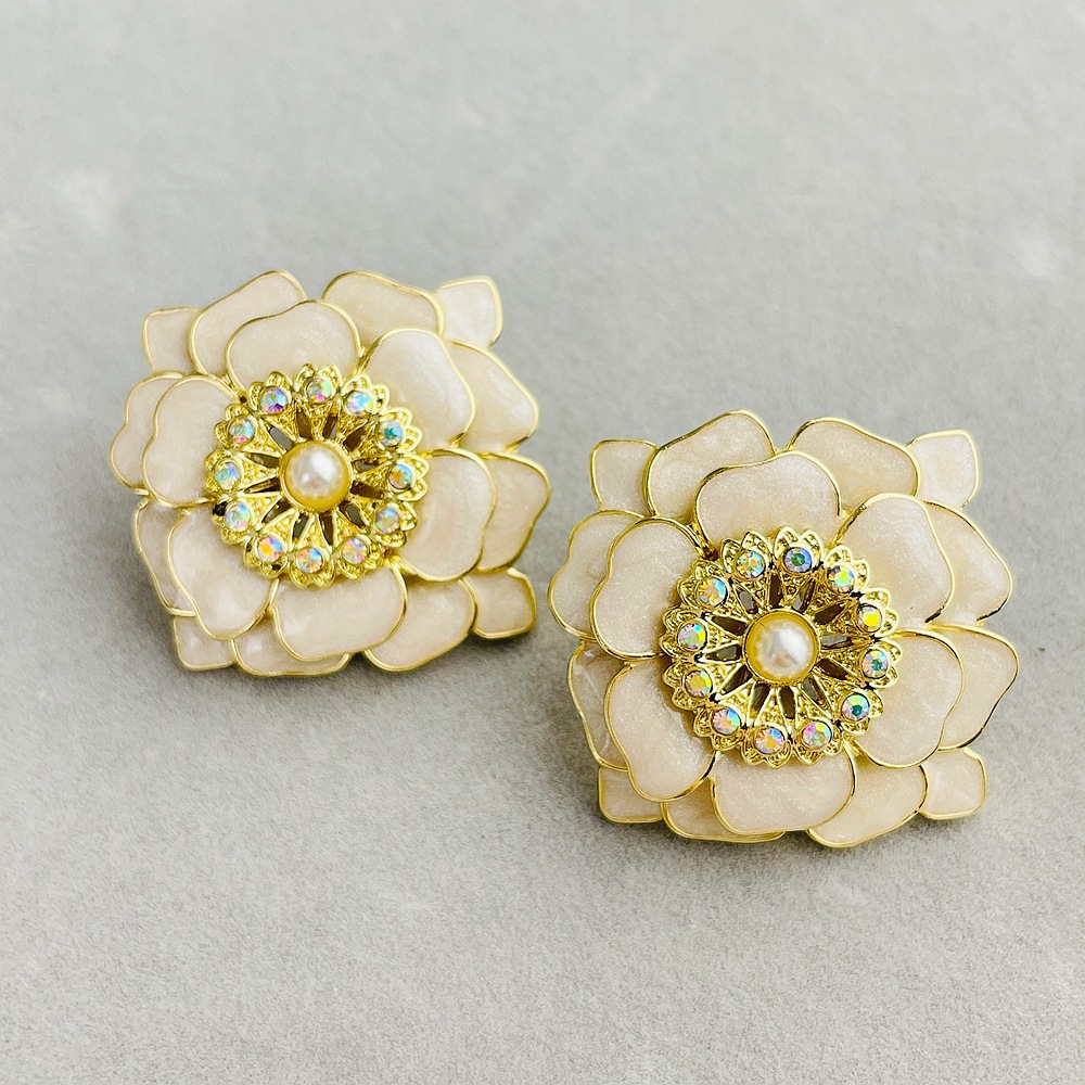 Hand-painted cream enamel camellia silver needle earrings colorful gemstone pistil women's new Chinese style wearing multi-layer earrings
