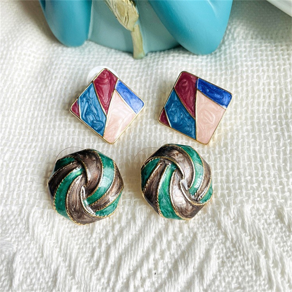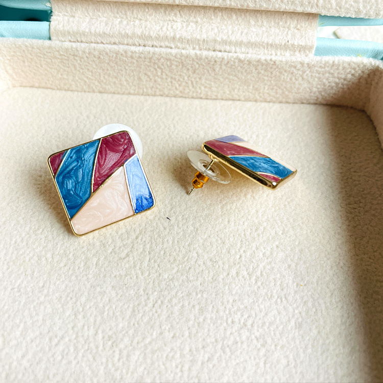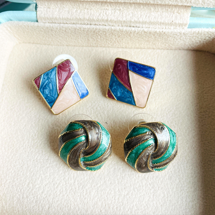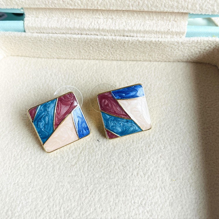 Internet Celebrant Cold Style Enamel Glaze Silver Pin Earrings French Vintage Oil Painting Contrast Color Alloy Geometric Earrings Women's Earrings