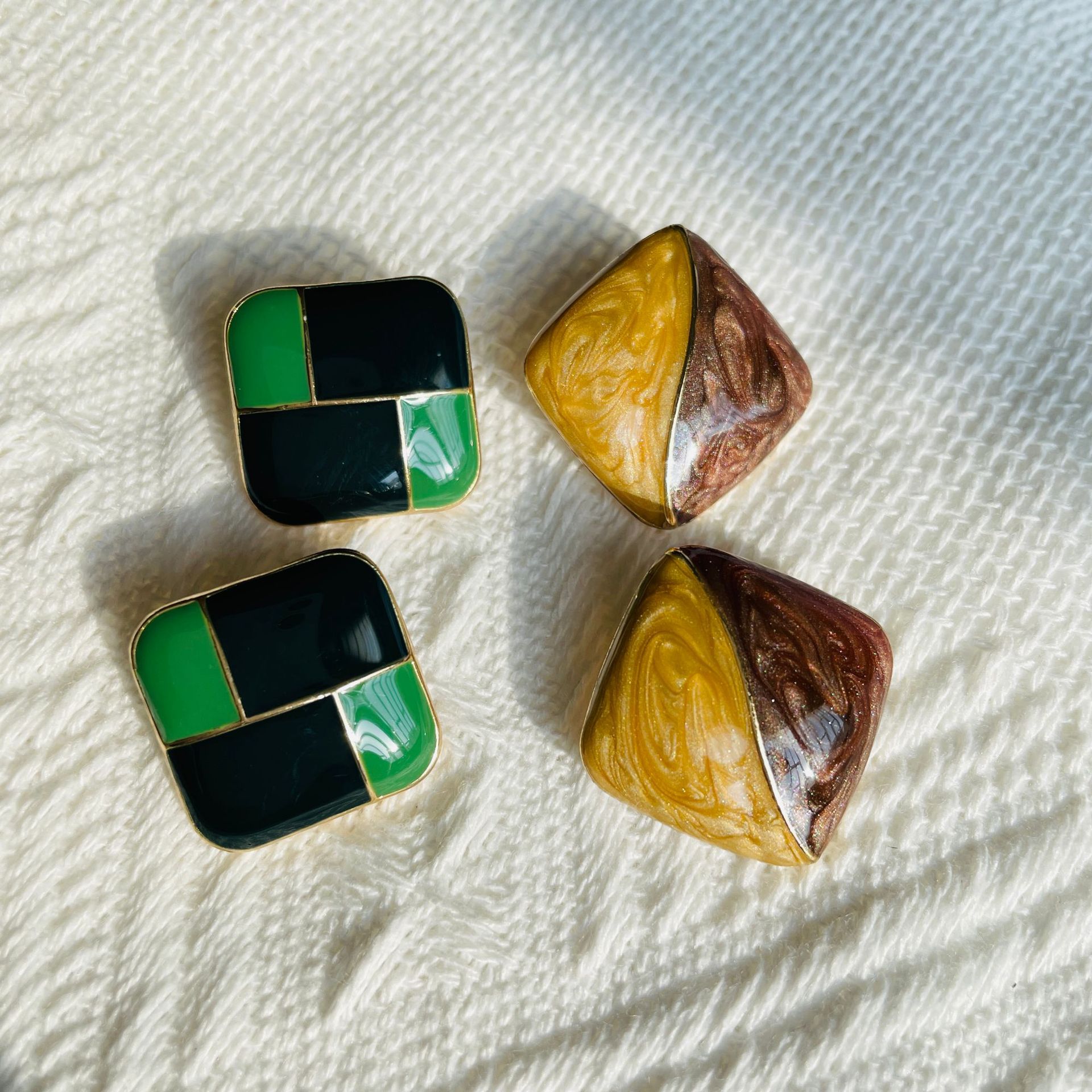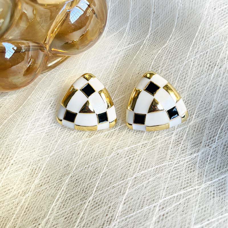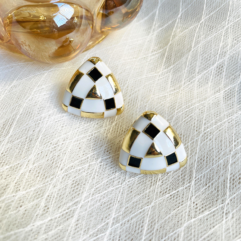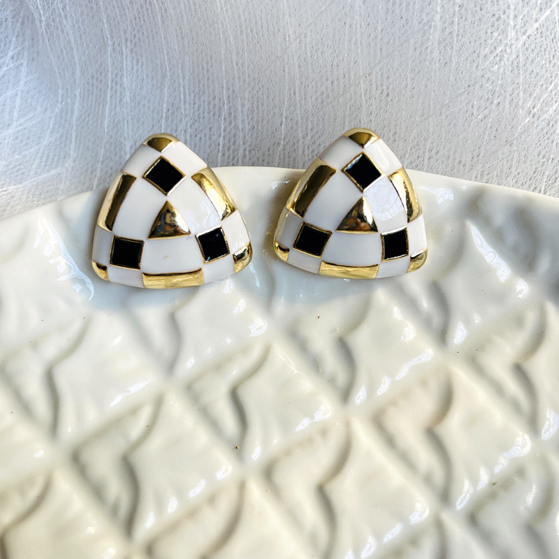Gold Plated Black and White Lattice Enamel Glaze Silver Pin Earrings Geometric Retro Earrings Hong Kong Style Temperament Ladies Alloy Earrings Accessories