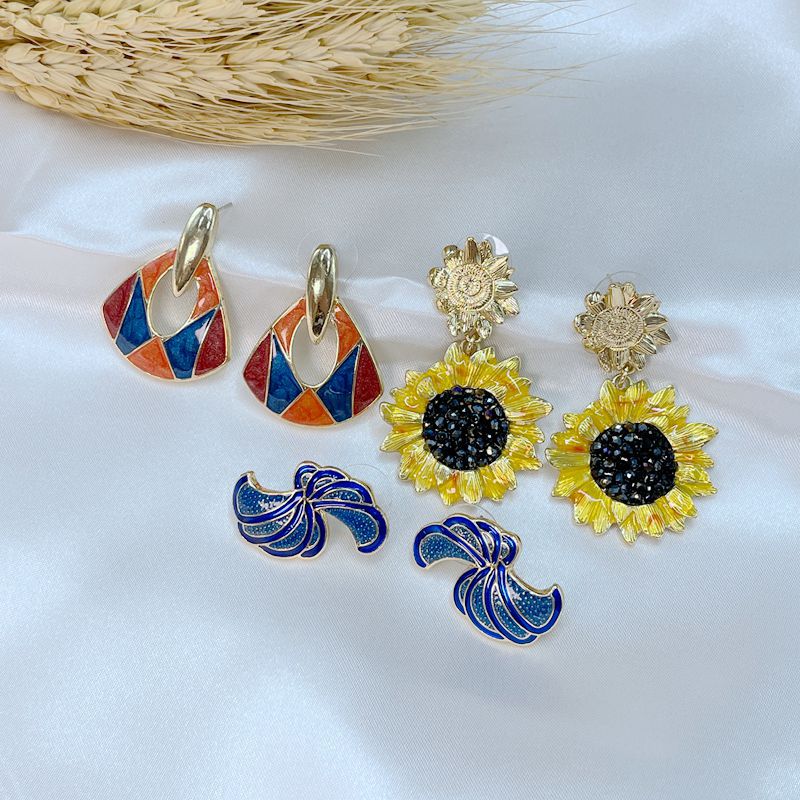 Sunflower Irregular Flowers Same Silver Pin Earrings Enamel Dropping Oil Earrings with Beads Ear Jewelry Women's Earrings