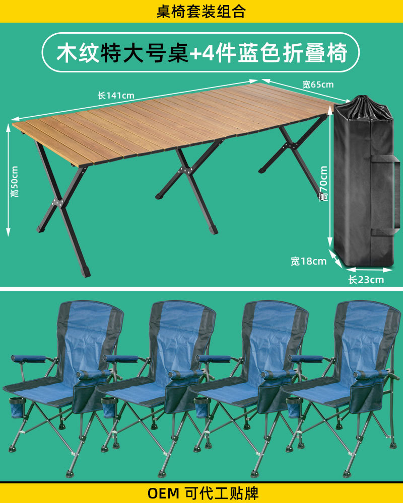 Outdoor folding table and chair suit picnic camping barbecue portable aluminum alloy armrest wood grain table and chair five-piece set