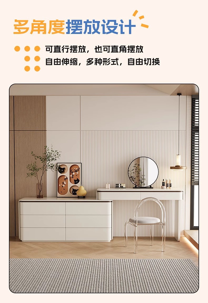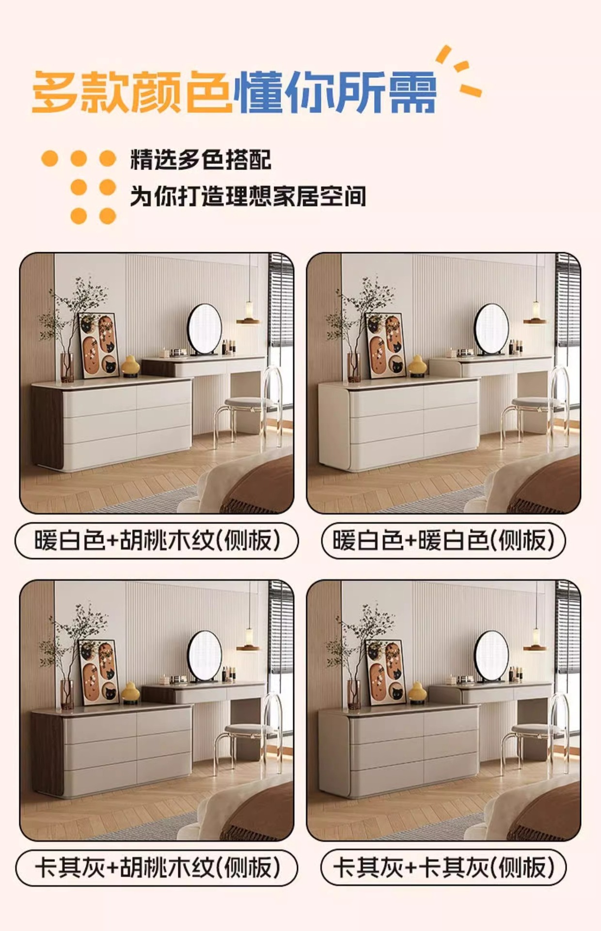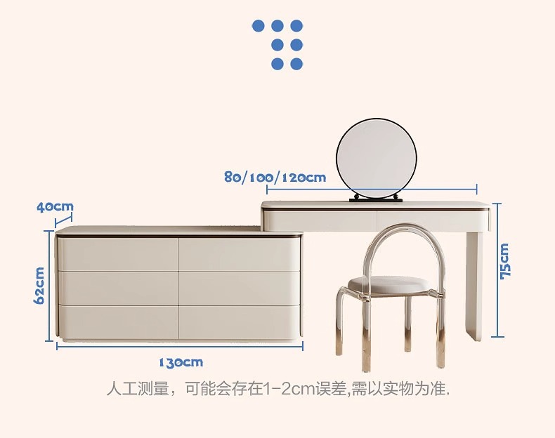 0.8梳妆台+0.6米三斗柜, 1.0梳妆台+0.6米三斗柜, 1.2梳妆台+0.6米三斗柜, 0..8米梳妆台+1.3米六斗柜, 1.0米梳妆台+1.3米六斗柜, 1.2米梳妆台+1.3米六斗柜, 配套LED云朵镜子一个, 配套亚克力椅1张, 配套圆镜子1个