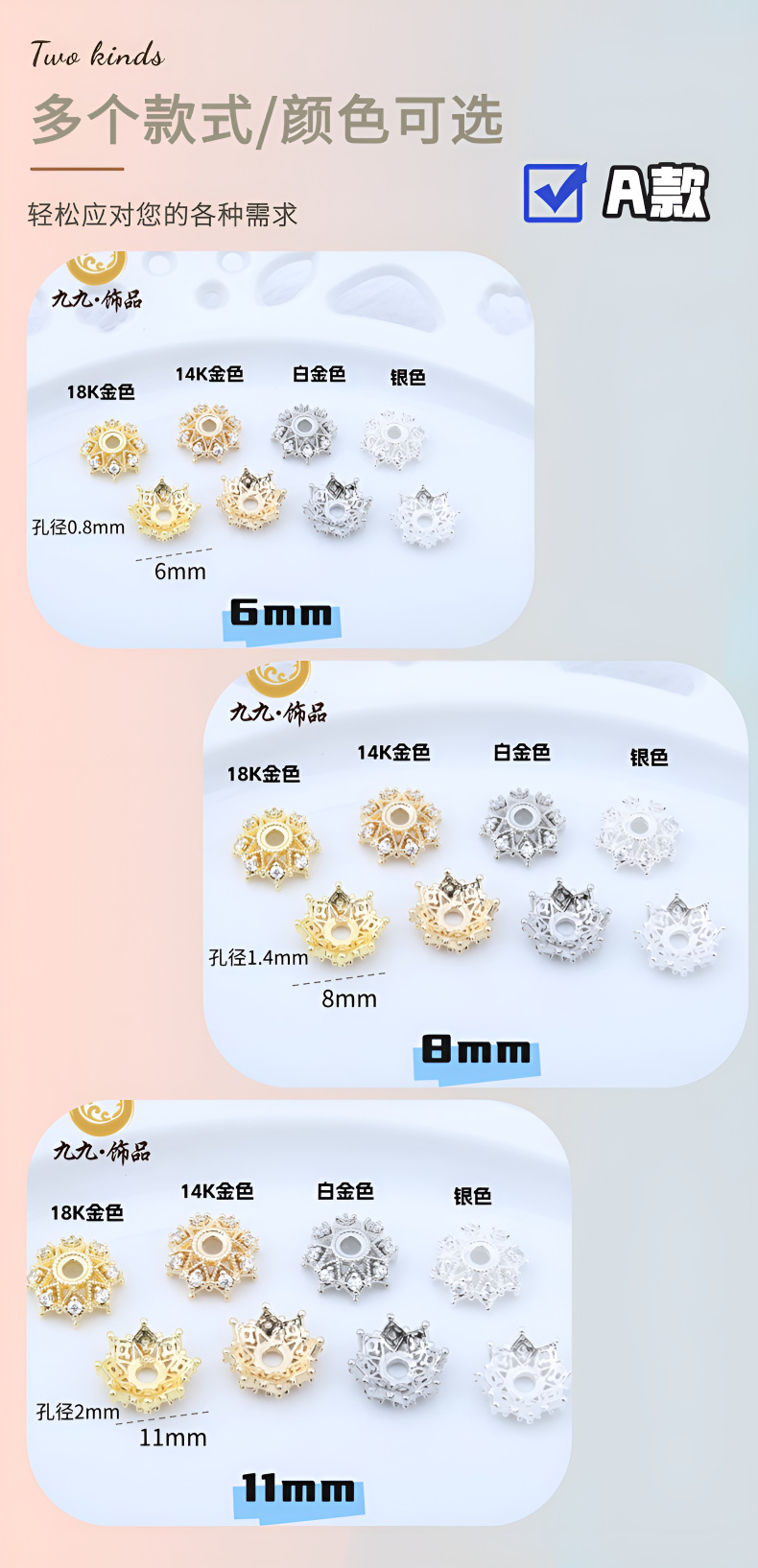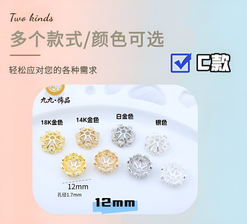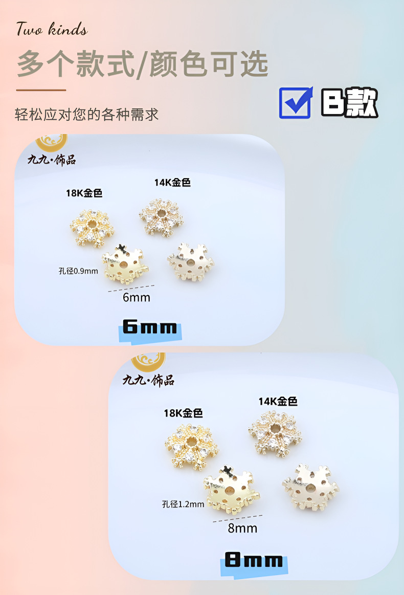 A款8mm/1个, A款11mm/1个, B款6mm/1个, B款8mm/1个, C款12mm/1个, 9mm金色
